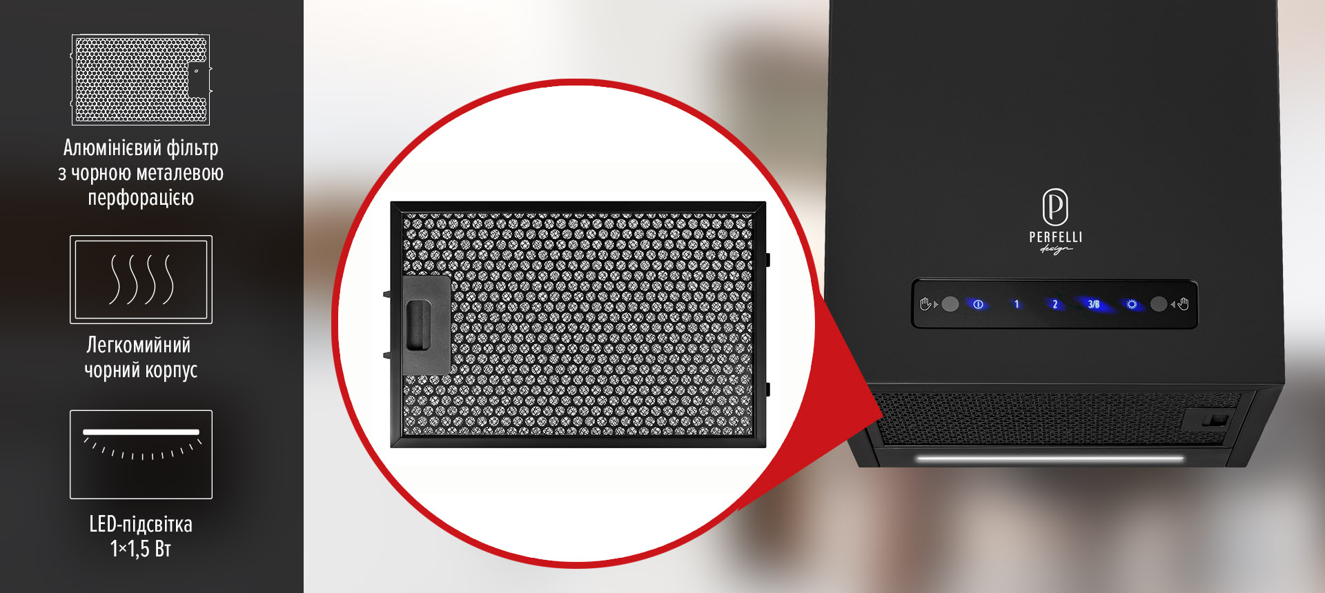 Корпус моделі виконаний у глибокому матово-чорному кольорі, що гармонійно вписується в сучасні кухні. Чорний фільтр з алюмінієвою перфорацією чудово виконує свою роботу. На фасаді скляний елемент зі стійким до подряпин покриттям, гладеньке і легкомийне. Матеріали не бояться вологи чи кухонних забруднень. Стильний лаконічний вигляд витяжки прикрасить вашу кухню в стилі від класики до хай-теку.