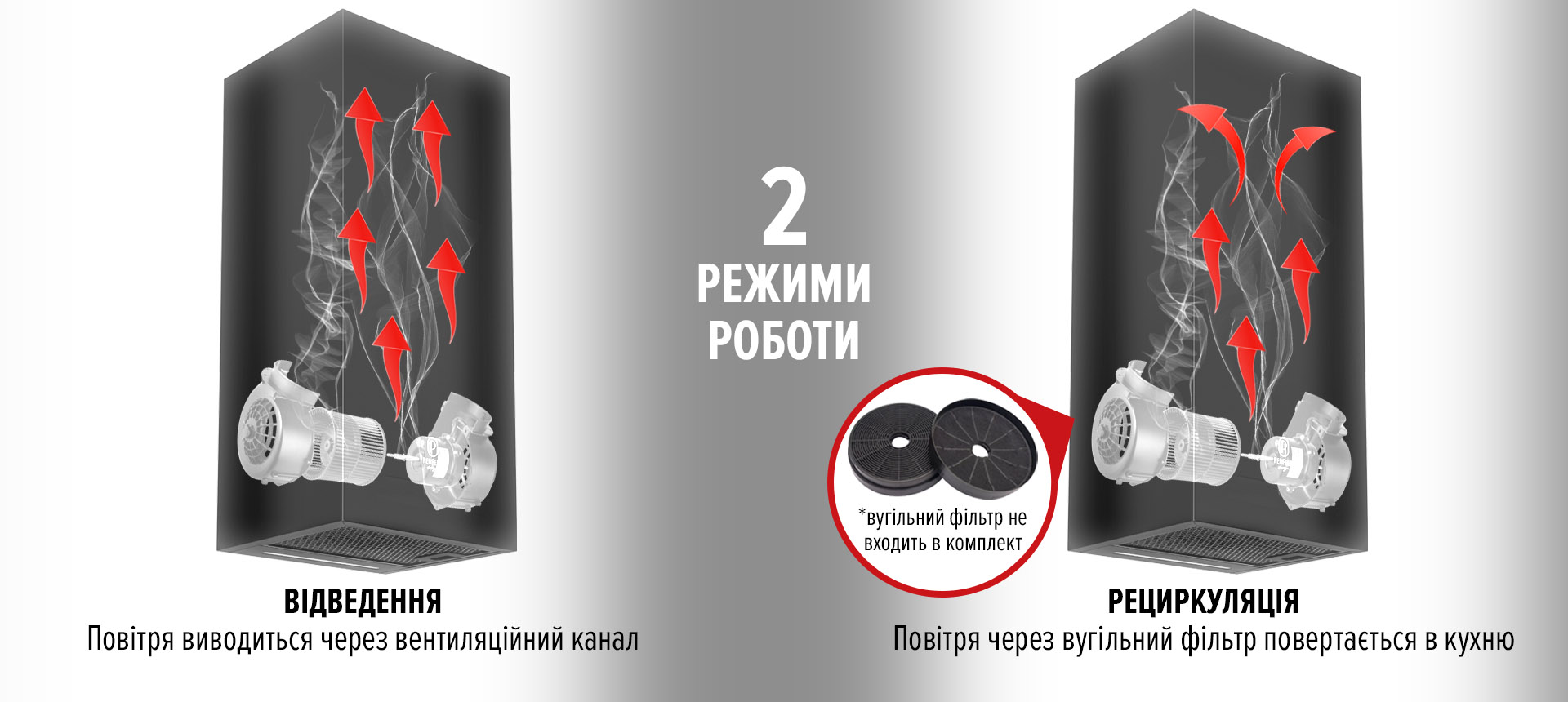 Витяжка може працювати як у режимі відведення повітря, так і в режимі рециркуляції. Це означає, що ви можете підключити її до вентиляційного каналу або використовувати окремо придбаний вугільний фільтр для режиму рециркуляції. В такому режимі витяжка ефективно виводить усі запахи назовні і не обтяжує інтер’єр гофрою чи кожухом.