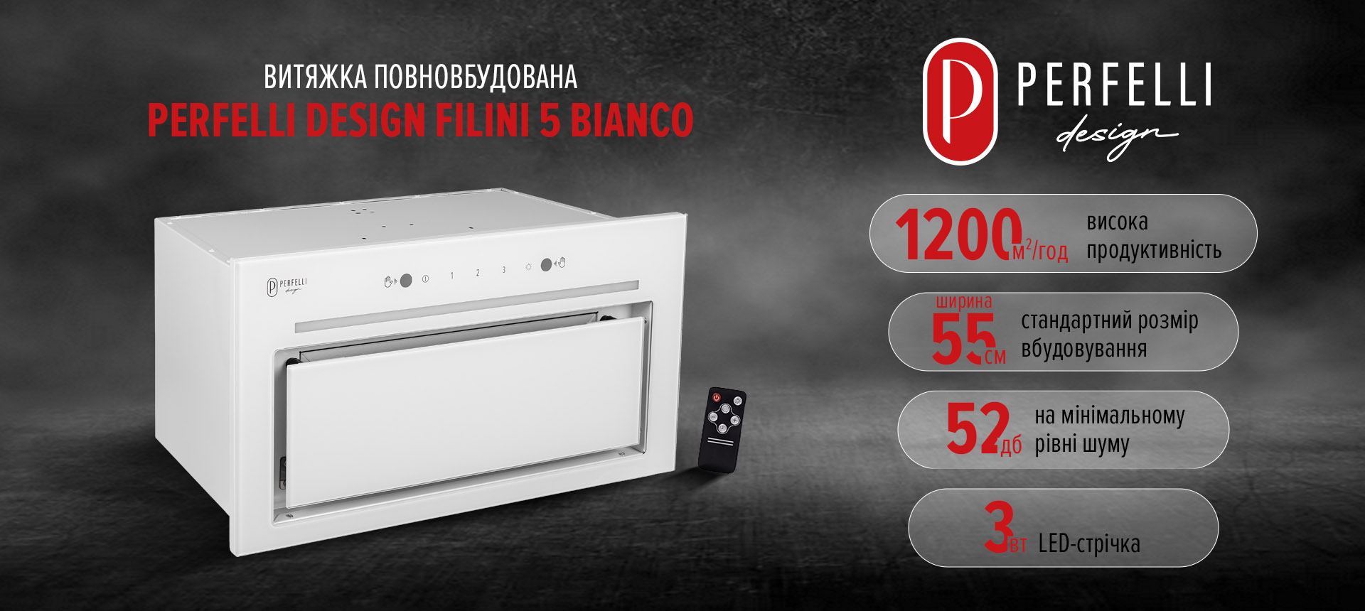 Основні характеристики Витяжка повновбудована PERFELLI DESIGN FILINI 5 BIANCO