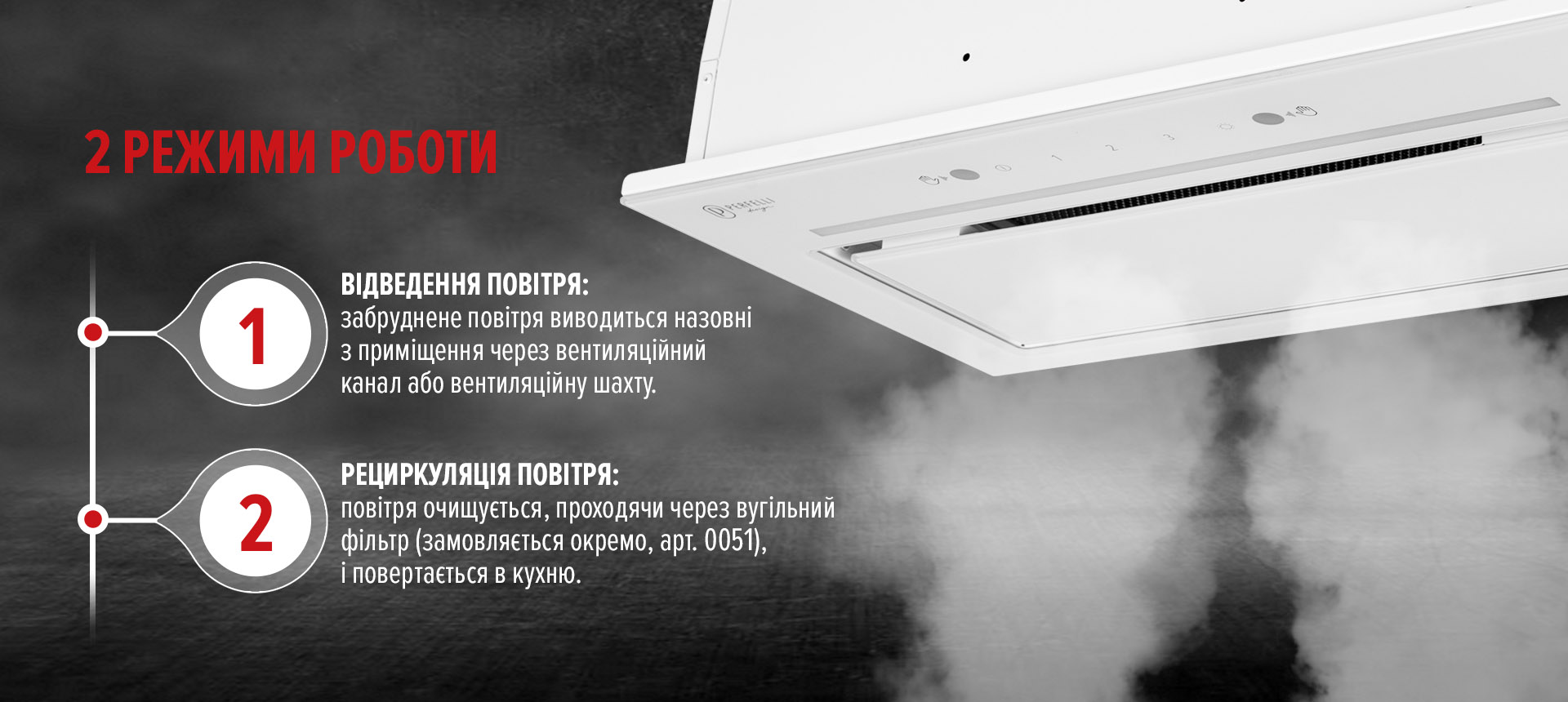Щоб витяжка працювала в режимі рециркуляції, необхідно встановити вугільний фільтр (замовляється окремо). Він поглинає запахи, дим і дрібні частинки, очищуючи повітря, перш ніж повернути його у приміщення. Один фільтр служить в середньому 3–6 місяців, залежно від інтенсивності готування.