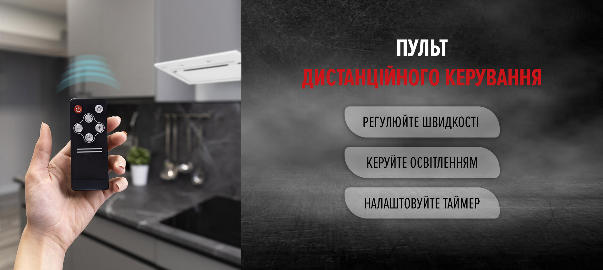 Витяжка має три рівні швидкості та інтелектуальне сенсорне управління. У комплекті є пульт дистанційного керування.