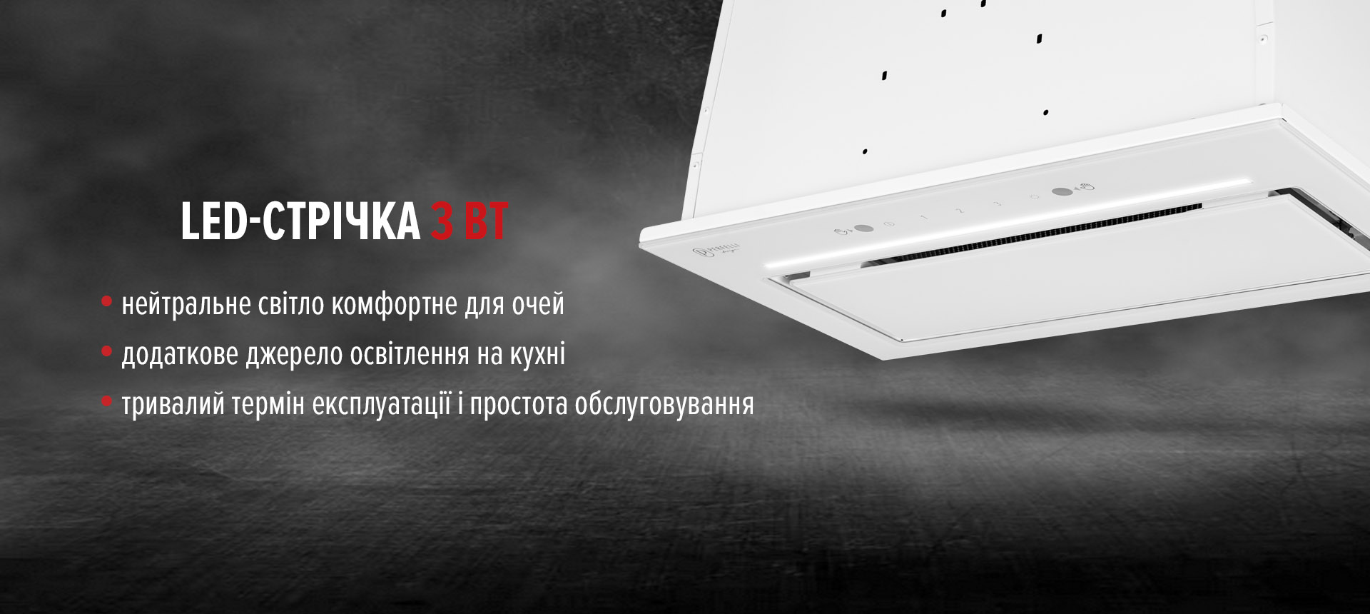 LED-стрічка 3 Вт забезпечує комфортне та м’яке підсвічування зони приготування. Світло яскраве, але не сліпуче, воно економне та довговічне.