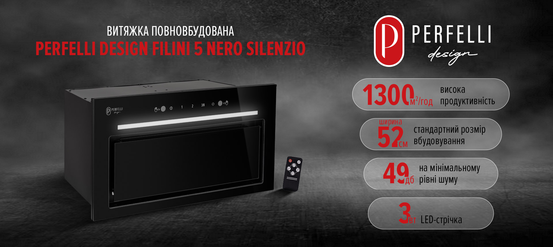 Основні характеристики Витяжка повновбудована PERFELLI DESIGN FILINI 5 NERO SILENZIO