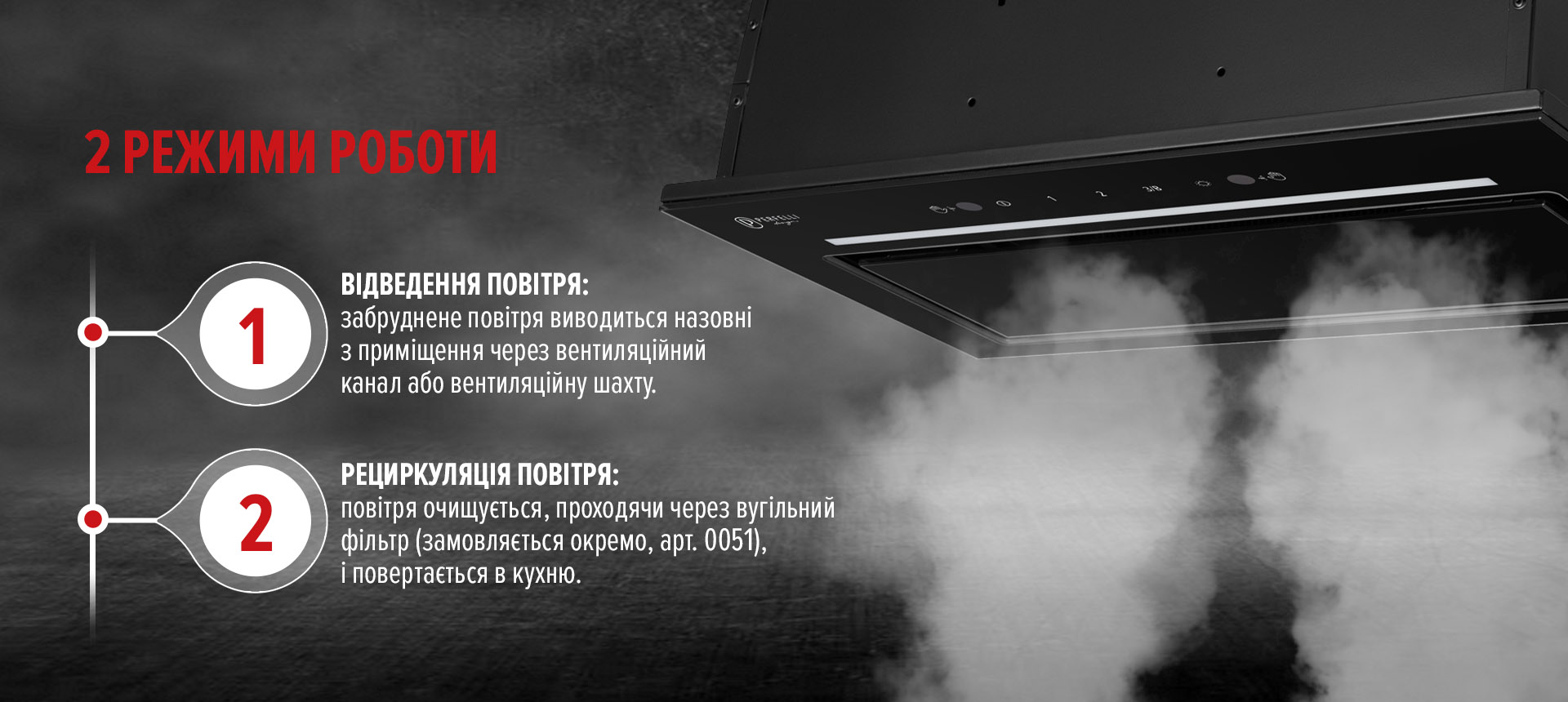 Класичний режим відведення швидко виводить запахи назовні через вентиляцію. Якщо немає доступу до вентиляційного каналу — працює режим рециркуляції: повітря проходить через вугільний фільтр і повертається у приміщення вже очищеним. Це зручно для квартир-студій або кухонь без окремого повітроводу.