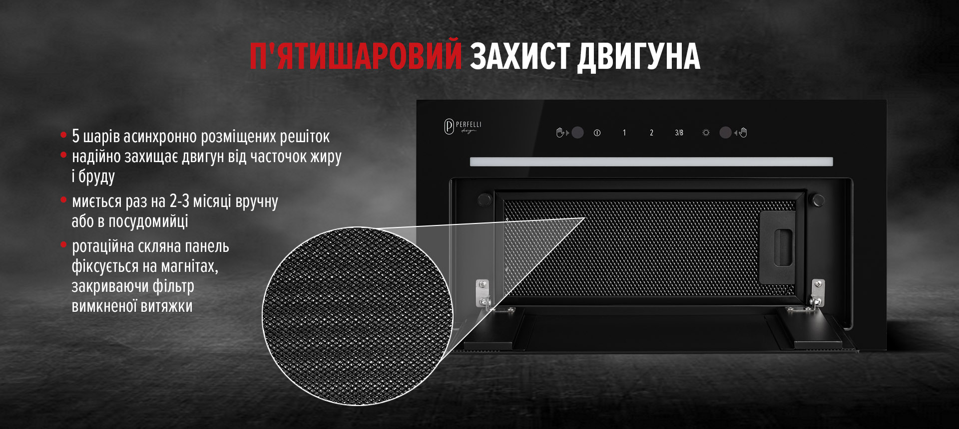 • П’ятишаровий алюмінієвий фільтр чорного кольору з класом ефективності E. Він розміщений під міцною скляною панеллю, яка фіксується магнітами. Це дозволяє легко очищати фільтр і зберігати бездоганний вигляд витяжки.