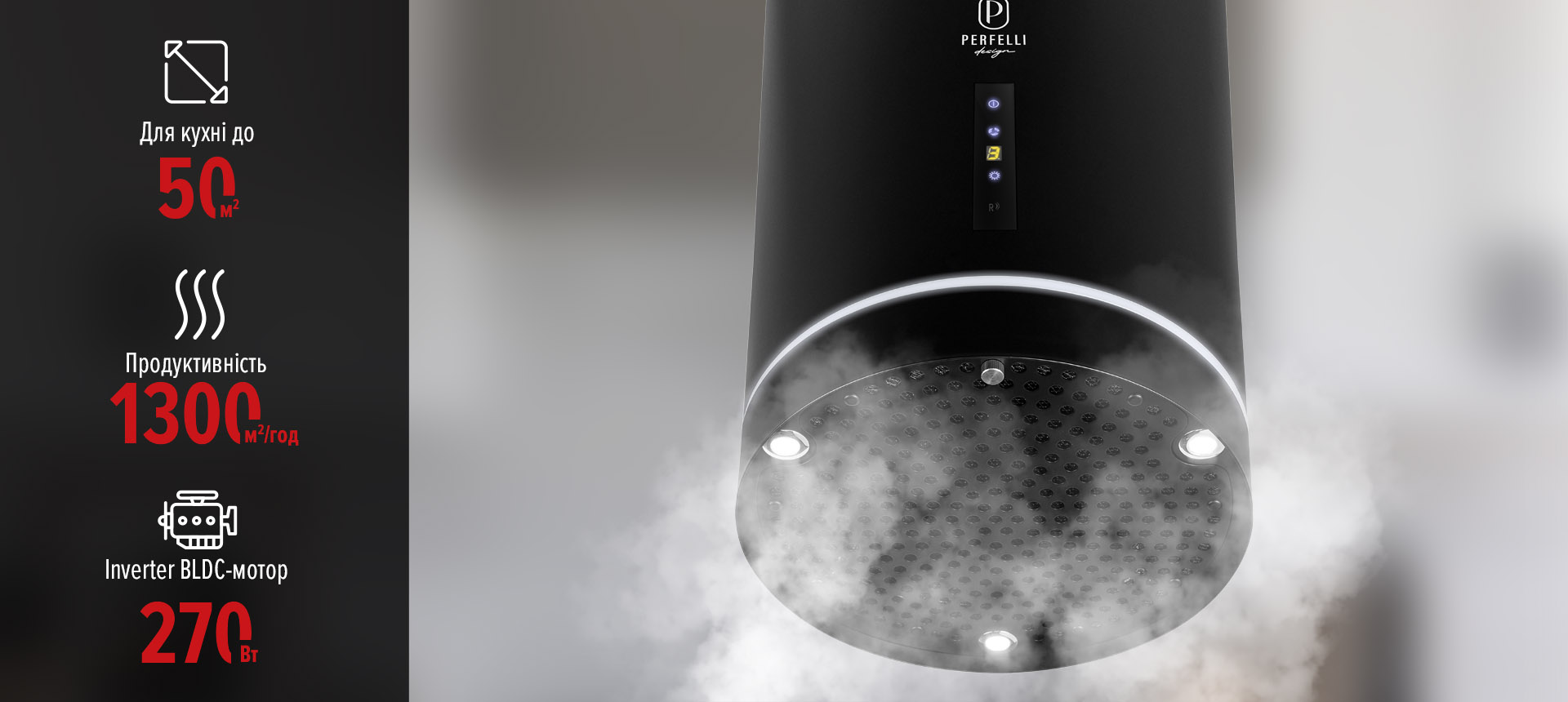 Корпус у матовому чорному кольорі додає акцент до дизайнерської індивідуальності кухні. Сенсорна панель сучасна, естетична і приємна на дотик. Потужний 1300 м³/год BLDC-мотор швидко очищує повітря навіть під час інтенсивного приготування. Booster-режим дозволяє миттєво підсилити тягу для видалення особливо сильних забруднень повітря.