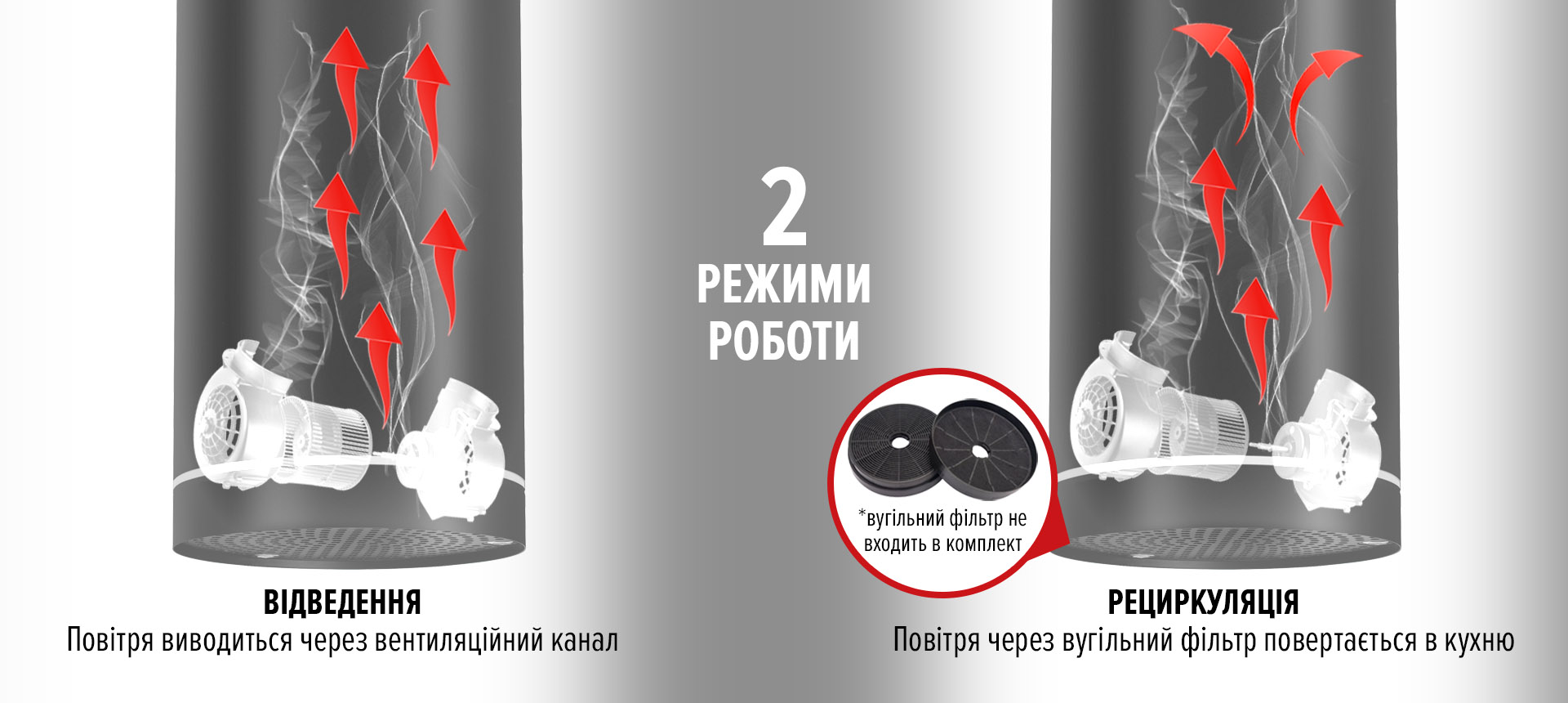 Два режими роботи — перевага, яку важко переоцінити. Встановлення витяжки в режимі відведення - класичний тип очищення повітря з подальшим виводом бруду і кіптяви у вентиляційну шахту. Для рециркуляції у квартирі без доступу до шахти у витяжку встановлюють вугільний фільтр. Обидва варіанти однаково ефективні для щоденного використання.
