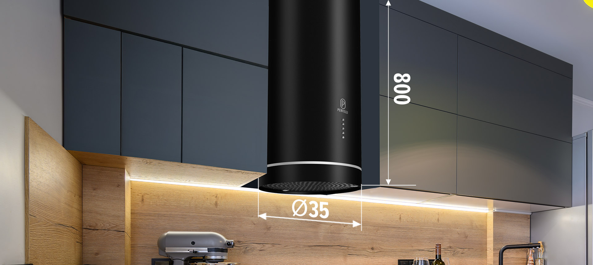 Модель PERFELLI FLOW 35PEB NERO має чорний металевий корпус з покриттям стійким до подряпин. Алюмінієвий фільтр з неіржавною перфорацією також пофарбований на чорне, легко миється і виглядає надзвичайно стильно.