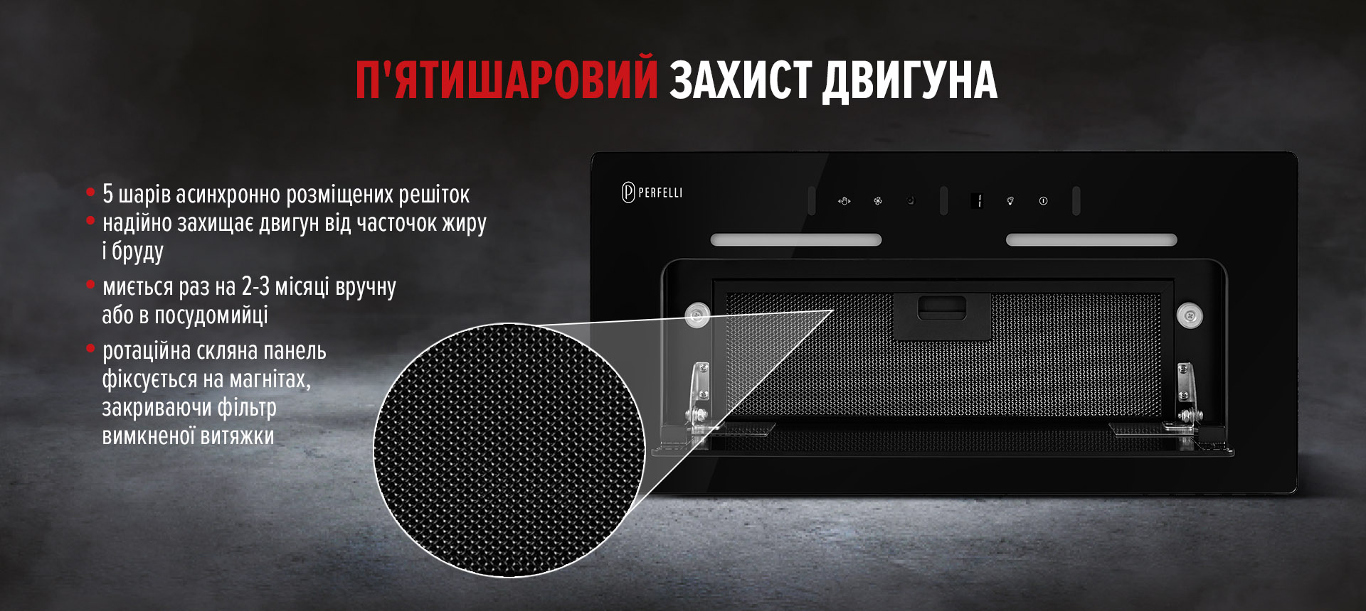 Витяжка оснащена п'ятишаровими алюмінієвим фільтром, який ефективно захищає двигун та інші деталі пристрою від забруднення жиром та випарами, забезпечуючи витяжці довготривалий термін експлуатації. Фільтр легко знімається та миється, що робить процес обслуговування максимально зручним. Рекомендується регулярно перевіряти та чистити фільтр (в залежності від інтенсивності використання приладу), щоб підтримувати оптимальну продуктивність витяжки.