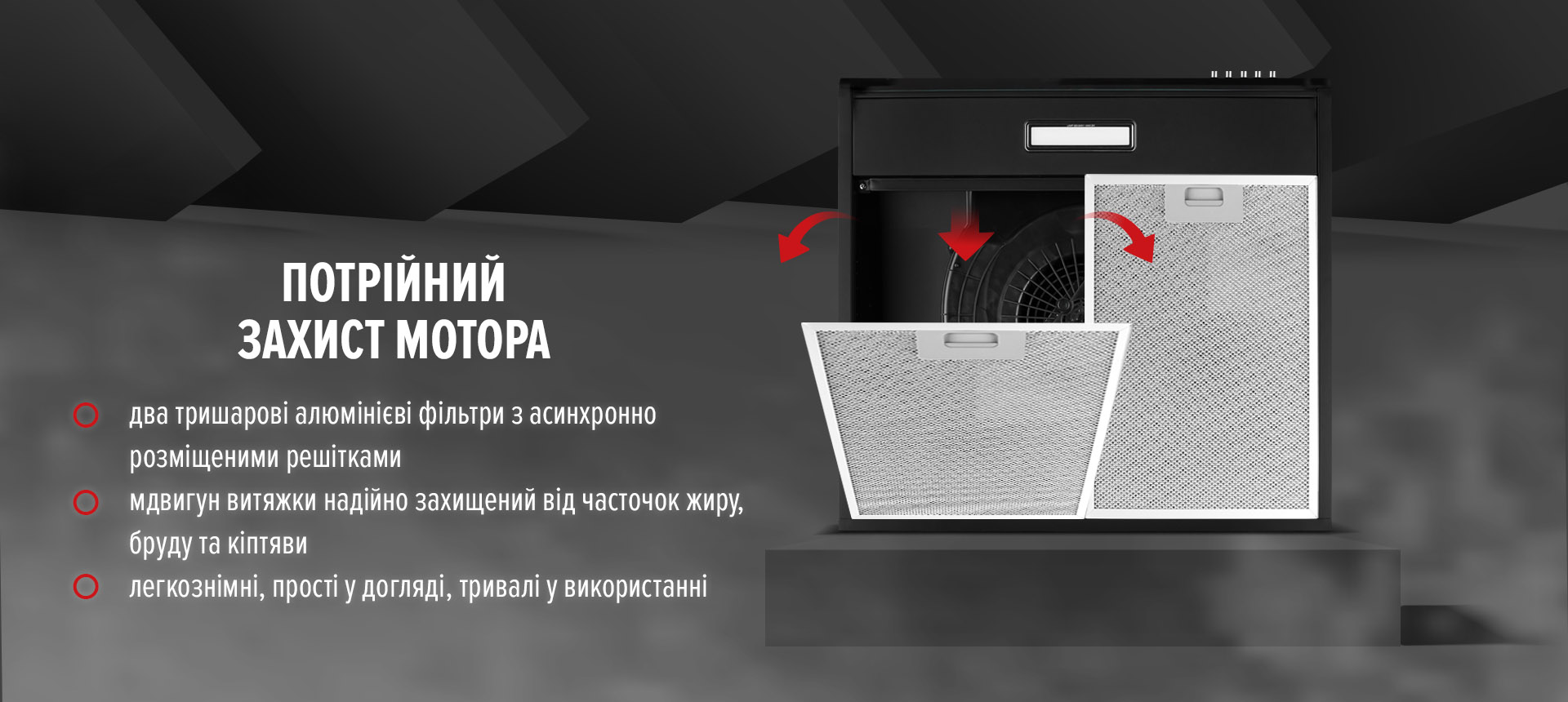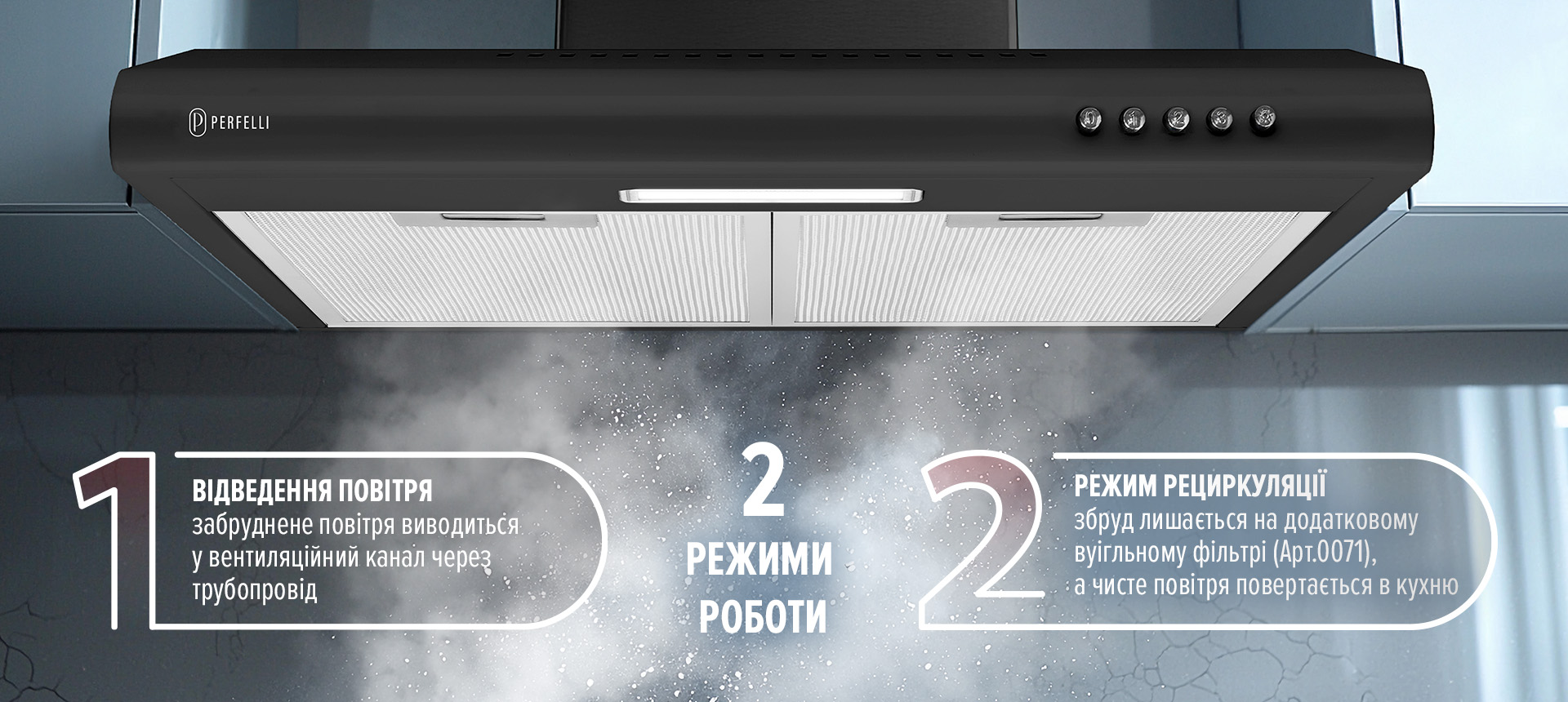 - Подвійний режим роботи — відведення в вентиляційну шахту або рециркуляція через фільтр — дає змогу адаптувати витяжку до будь-яких умов.