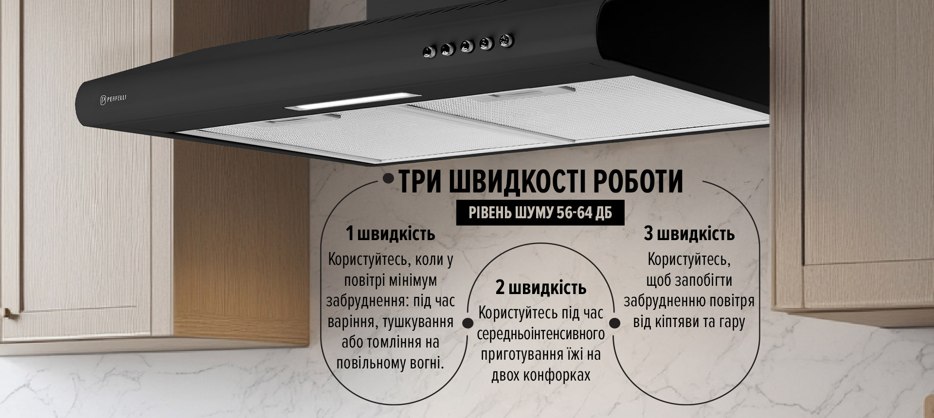 Шумовий діапазон витяжки починається від 51 дБ, що не заважає звуку звичайної розмови — робота пристрою не заважає спілкуванню чи перегляду телевізора. На низьких обертаннях пристрій працює тихо, що ідеально для вечірнього готування.