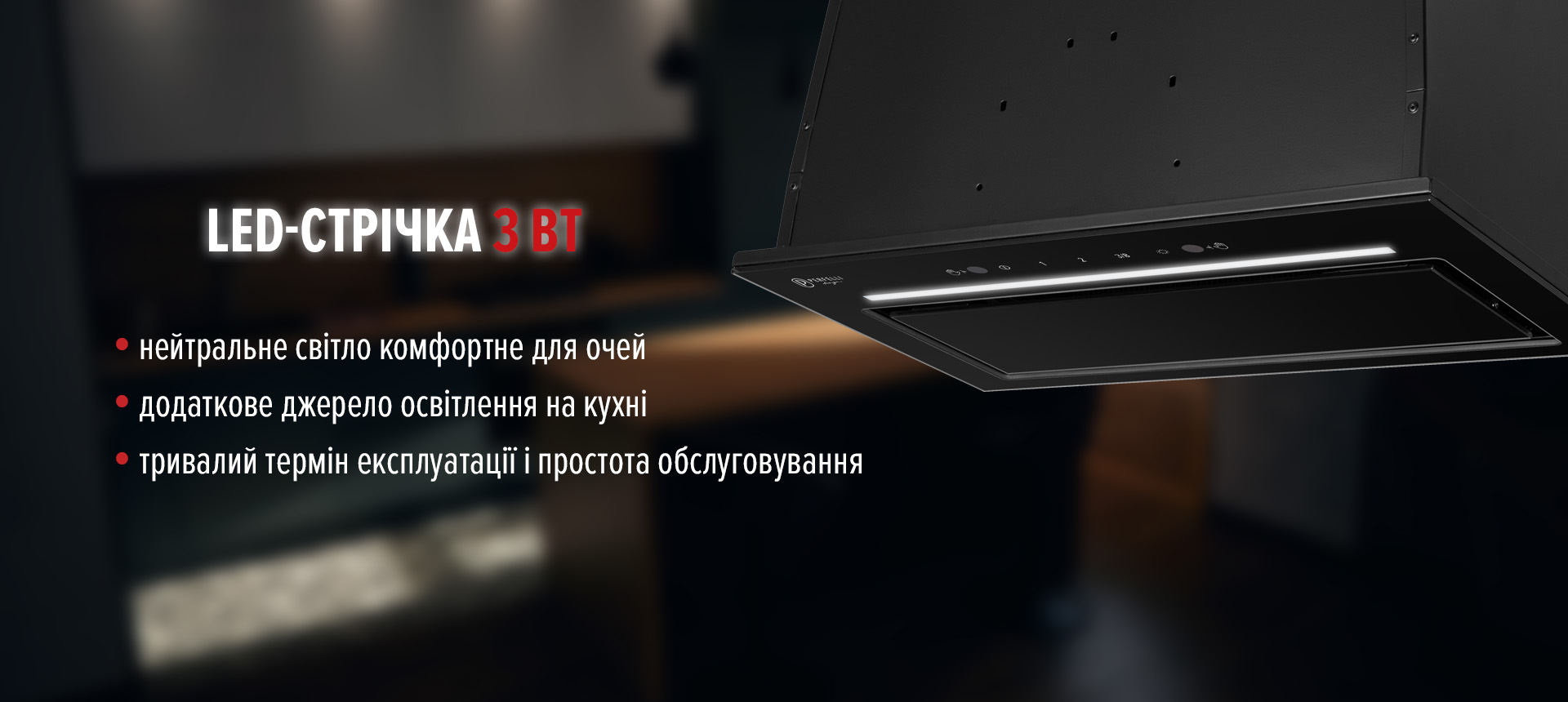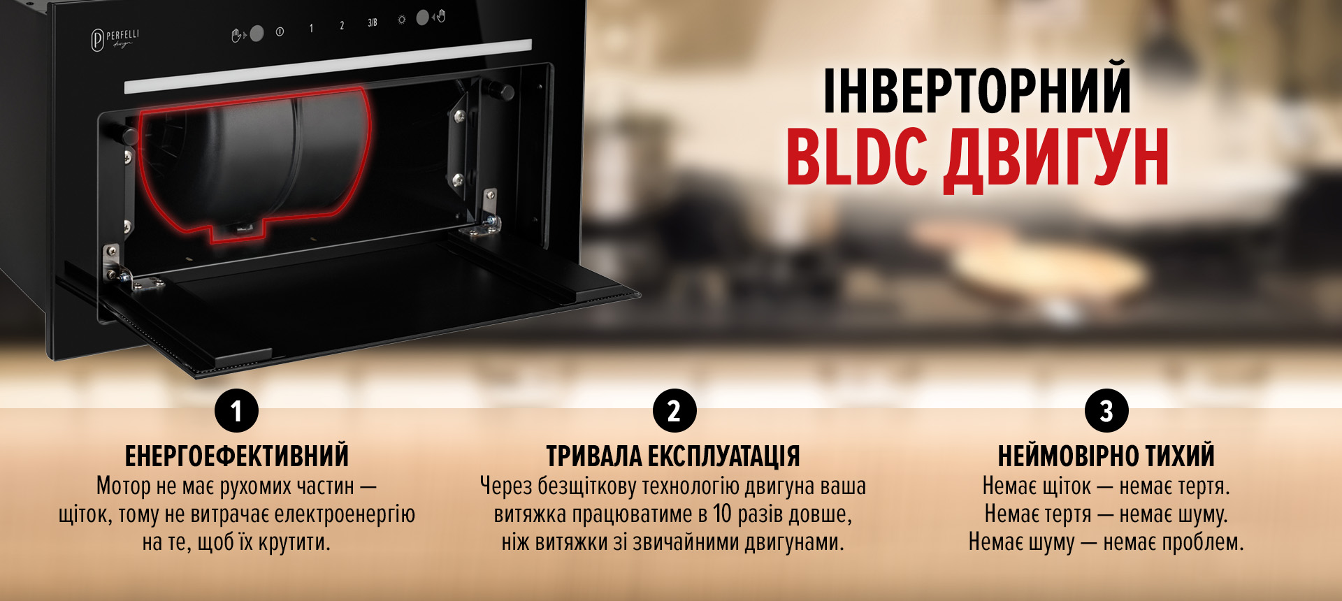 Вытяжка оборудована современным BLDC-мотором (безщеточным двигателем постоянного тока), который отличается крайне тихой и стабильной работой.