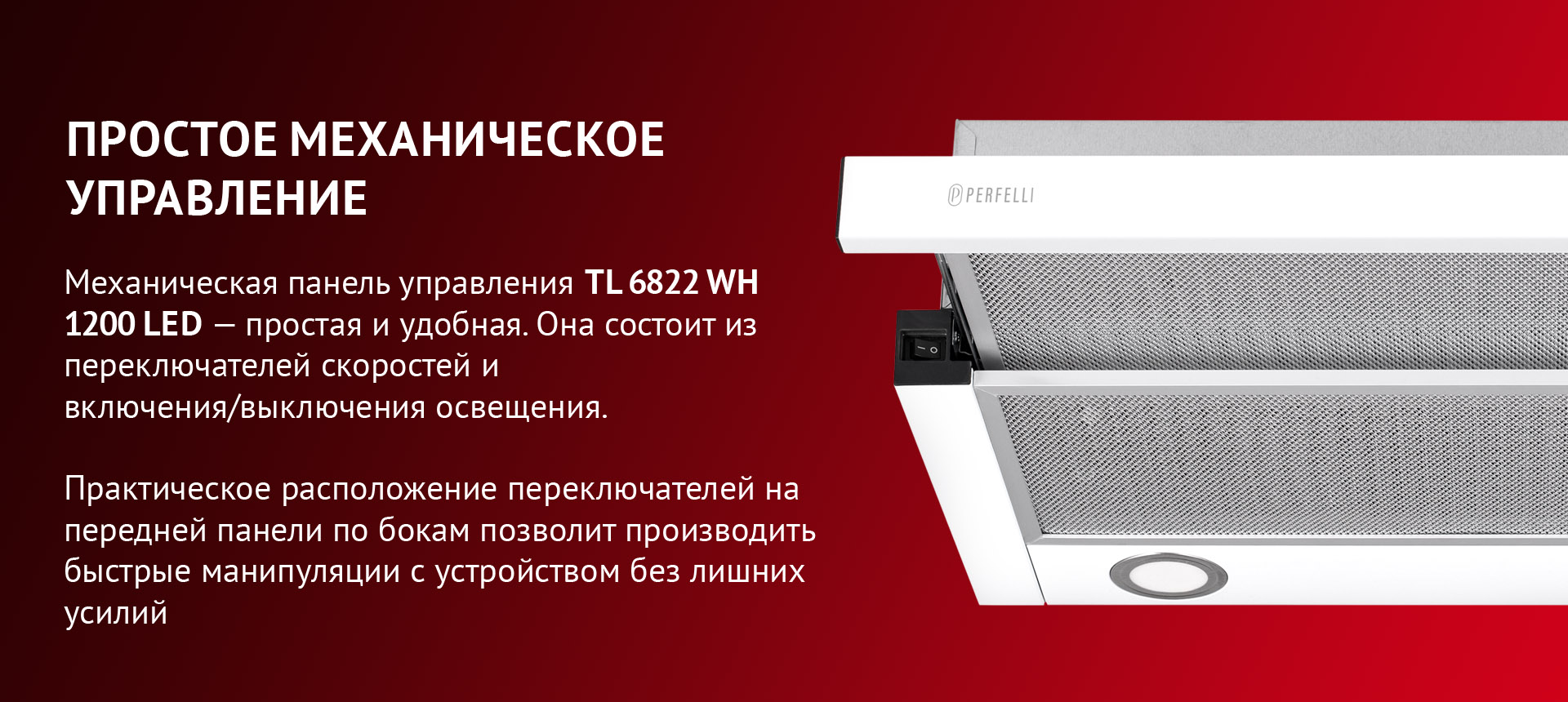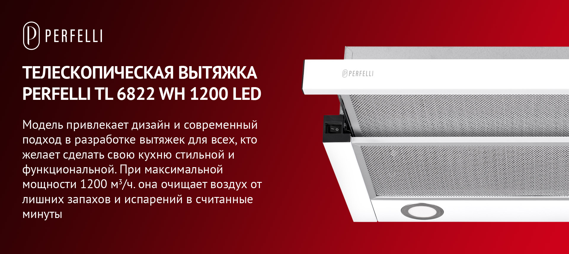 Телескопическая кухонная вытяжка PERFELLI TL 6822 WH 1200 LED обладает эргономичными свойствами, поэтому позволяет рационально использовать пространство в зоне над варочной поверхностью. Конфигурация модели включает: