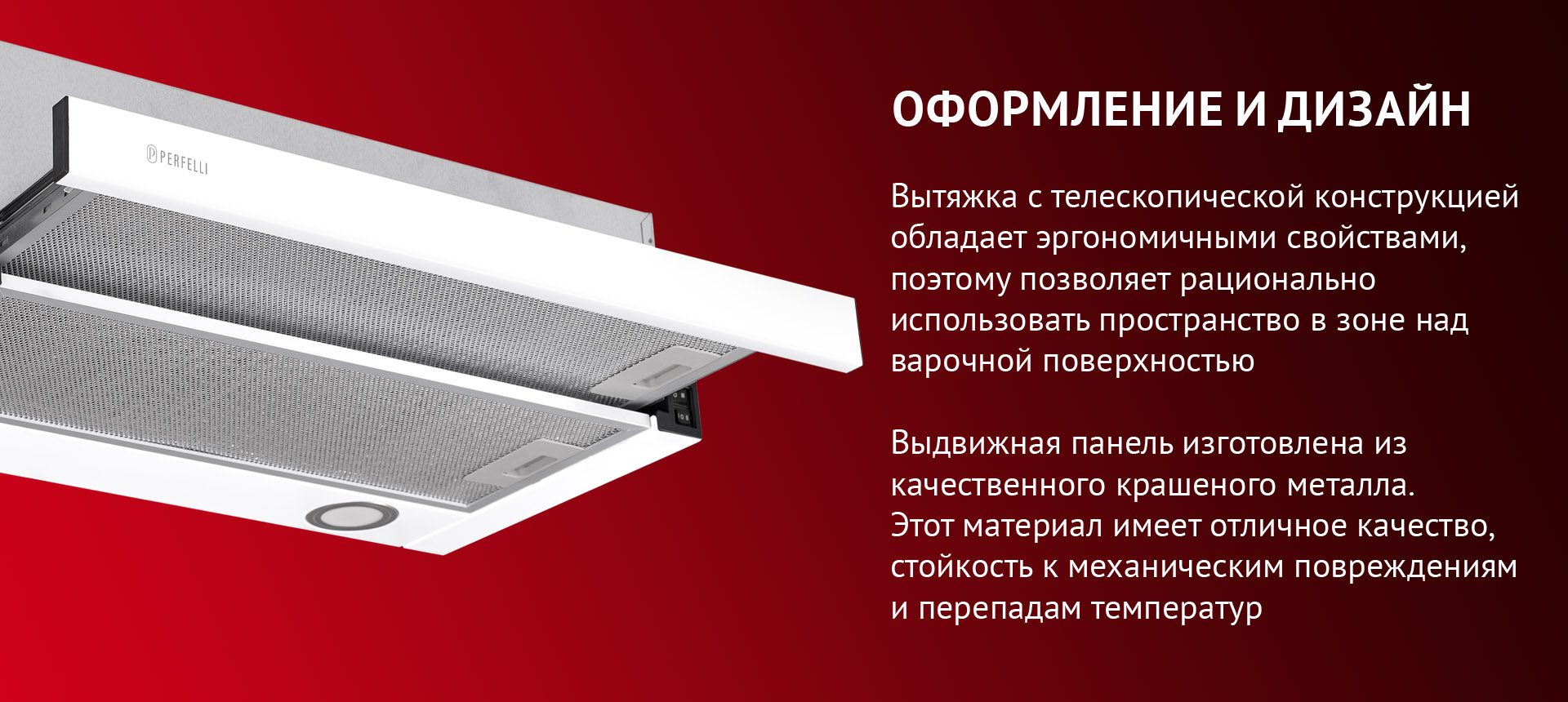 Вытяжка изготовлена ​​из крашеного металла. Этот материал обладает превосходными эстетическими качествами, высокой износостойкостью и устойчивостью к механическим повреждениям и перепадам температур.