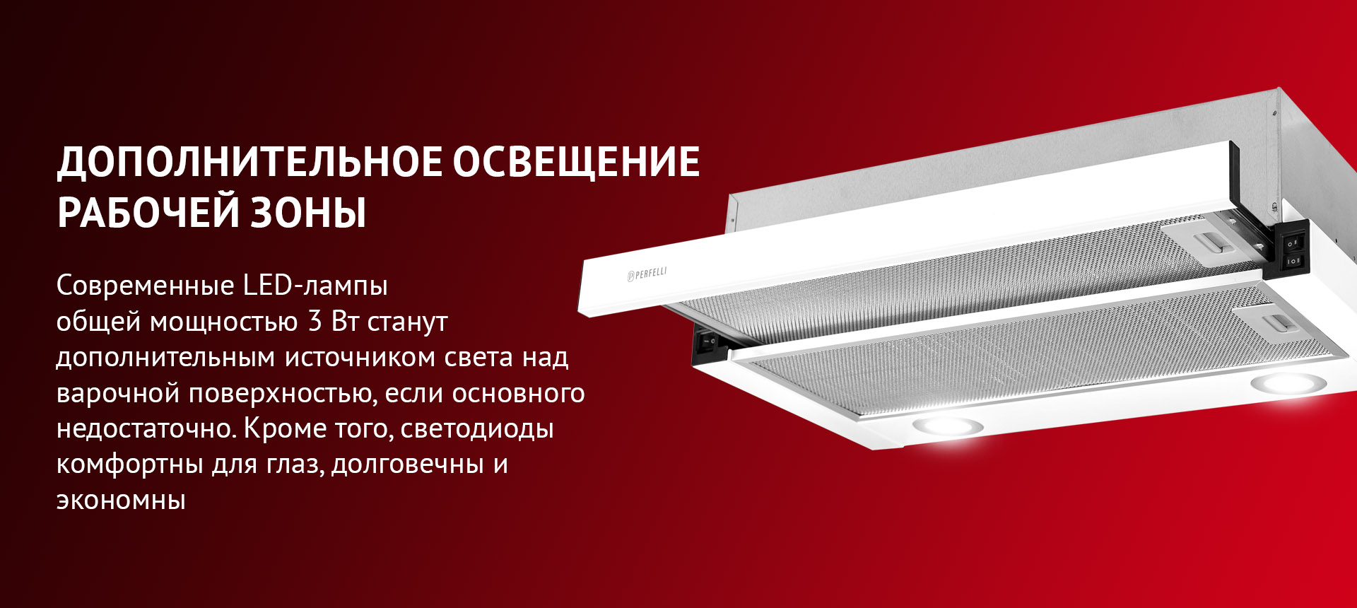 Осветление вытяжки состоит из двух LED-ламп, мощностью по 1.5 Вт, которые расположены на задней части вытяжки и способствуют лучшему освещению рабочей поверхности. Подсветка является комфортной для глаз и работает как дополнительный источник освещения на кухне. Рабочий ресурс светодиодов в разы выше, чем у обычных ламп, а потребление энергии минимально. Кроме того, светодиоды достаточно выносливы во время активной эксплуатации.