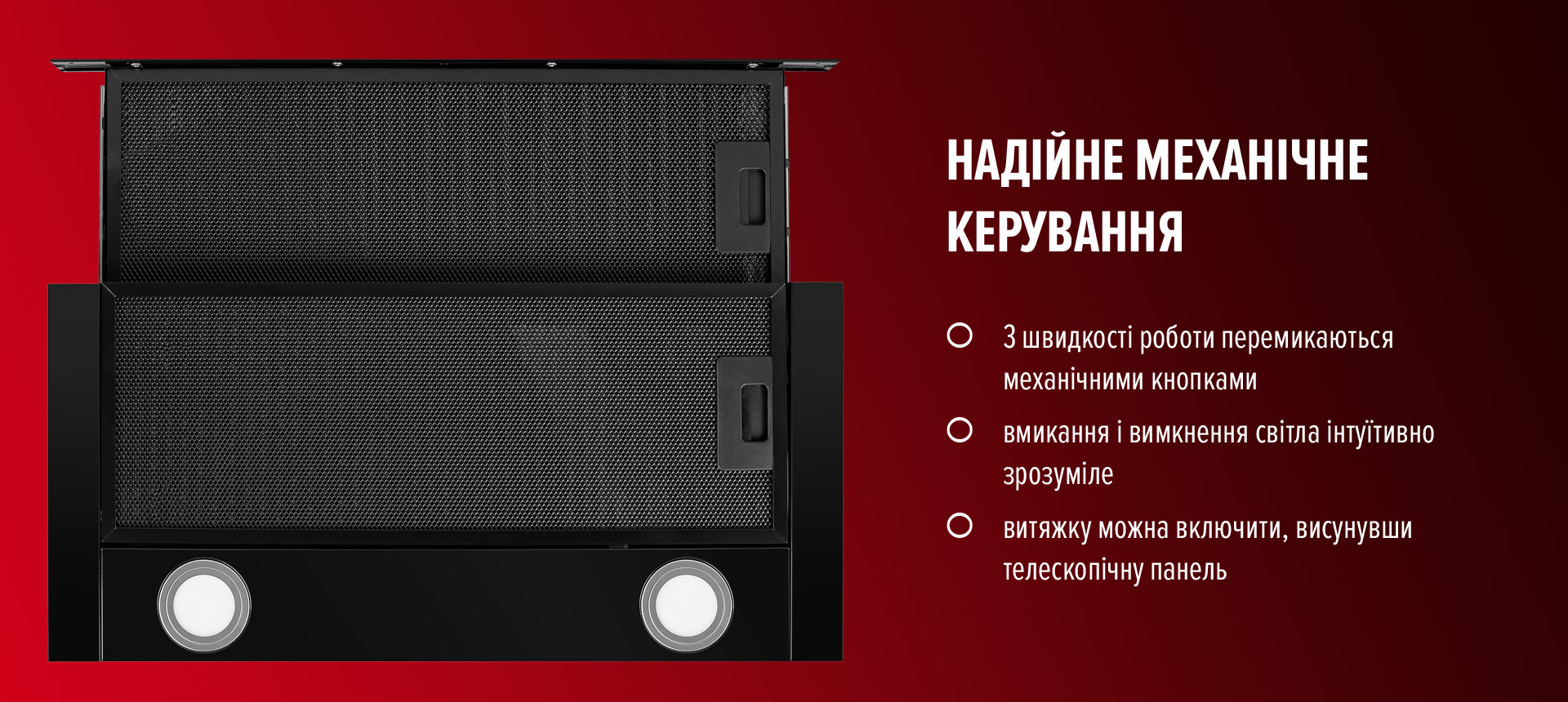 Керувати витяжкою зручно та легко! Механічна панель управління складається з перемикачів швидкостей та увімкнення/вимкнення освітлення. Практичне розташування механічних перемикачів керування з боків дозволить здійснювати швидкі маніпуляції з пристроєм без зайвих зусиль.